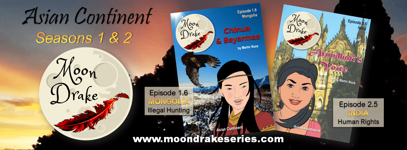 Over the next 6 blogs we are going to share the continent posters for Moon Drake episodes from Seasons 1 & 2. Our first poster is for the Asian Continent. Both of these beautiful stories were written by my friend and extraordinary writing partner, Martin Manuel Nuza